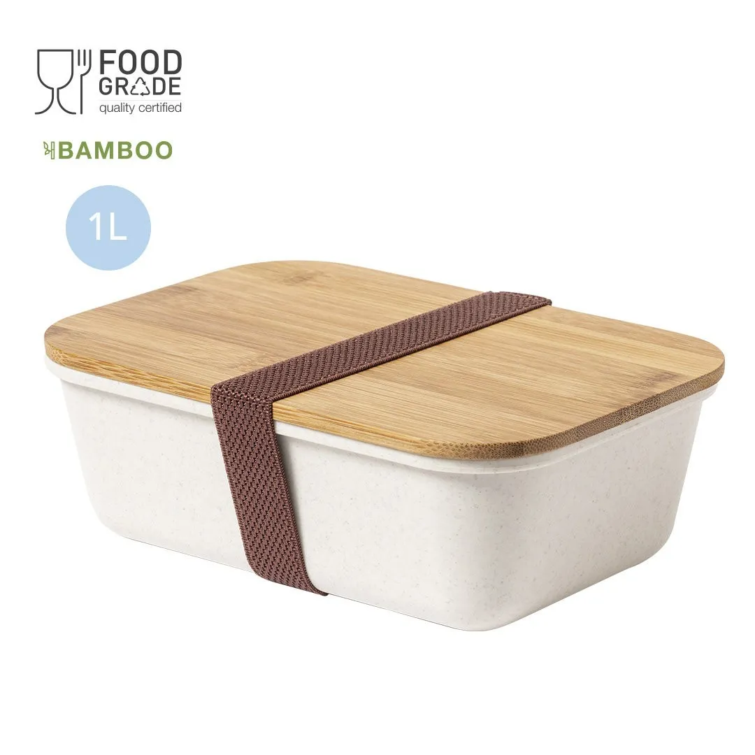 Fiambrera de 1l en resistente material PP veteado libre de BPA, con tapa de bambú. Cinta elástica de seguridad en tapa y certificación Food Grade, garantizando la seguridad cuando los alimentos entran en contacto con el material usado para fabricar el producto.