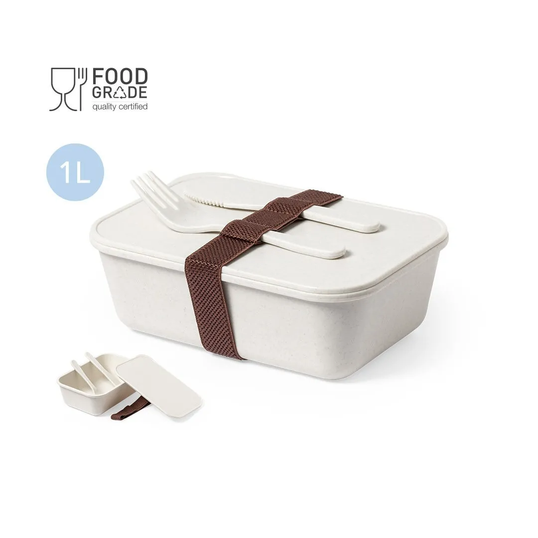 Fiambrera fabricada en PP veteado libre de BPA. De 1 l de capacidad, incluye cinta elástica de seguridad con tenedor y cuchillo. Certificación Food Grade, garantizando la seguridad cuando los alimentos entran en contacto con el material usado para fabricar el producto.