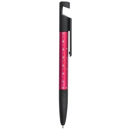 Bolígrafo 7 en 1 de mecanismo giratorio en variada gama de vivos colores. Con soporte para dispositivo móvil, puntero, limpiador de pantalla, regla integrada en cuerpo -cm y pulgadas-, destornilladores de punta plana y de estrella. Tinta azul.
