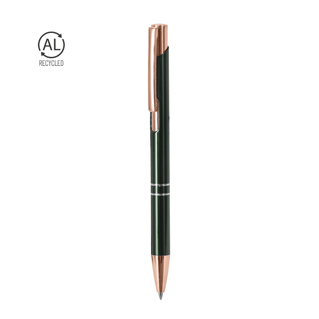 Bolígrafo de mecanismo pulsador fabricado en aluminio reciclado. Incluye accesorios plateados y clip, pulsador y punta en acabado rose gold. Tinta azul. Distintivo aluminio reciclado en la parte superior del bolígrafo.