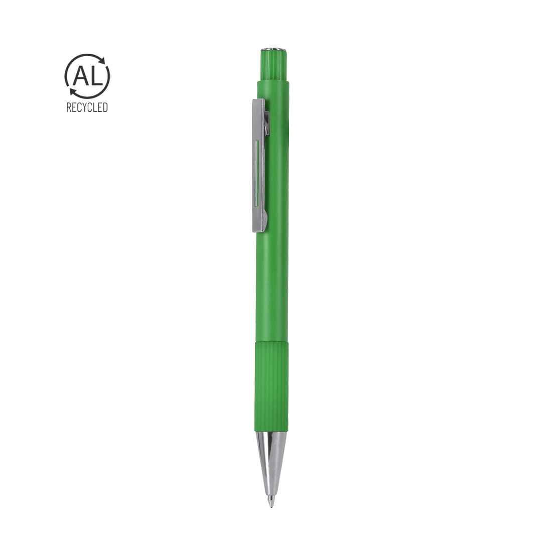 Original bolígrafo fabricado en Aluminio Reciclado en acabado mate. Con empuñadura en ABS. De cartucho jumbo y en tinta azul. Con distintivo logo de Aluminio Reciclado.