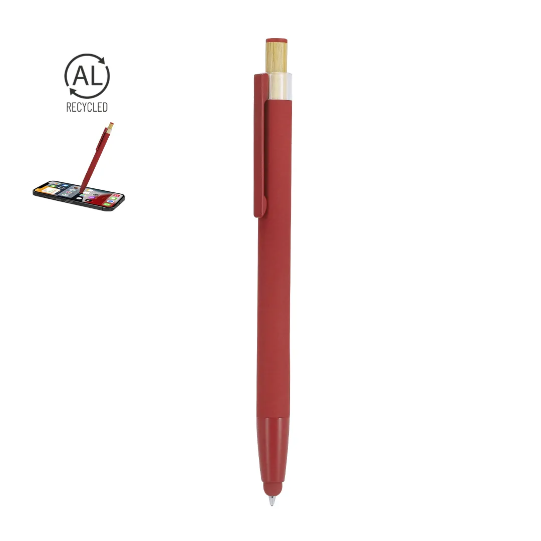 Bolígrafo puntero fabricado en aluminio reciclado. Cuerpo en acabado gomoso. Diseñado con pulsador en bambú y detalle superior a juego con el color del cuerpo y clip metálico a tono. Mecanismo pulsador. Incluye distintivo aluminio reciclado.
