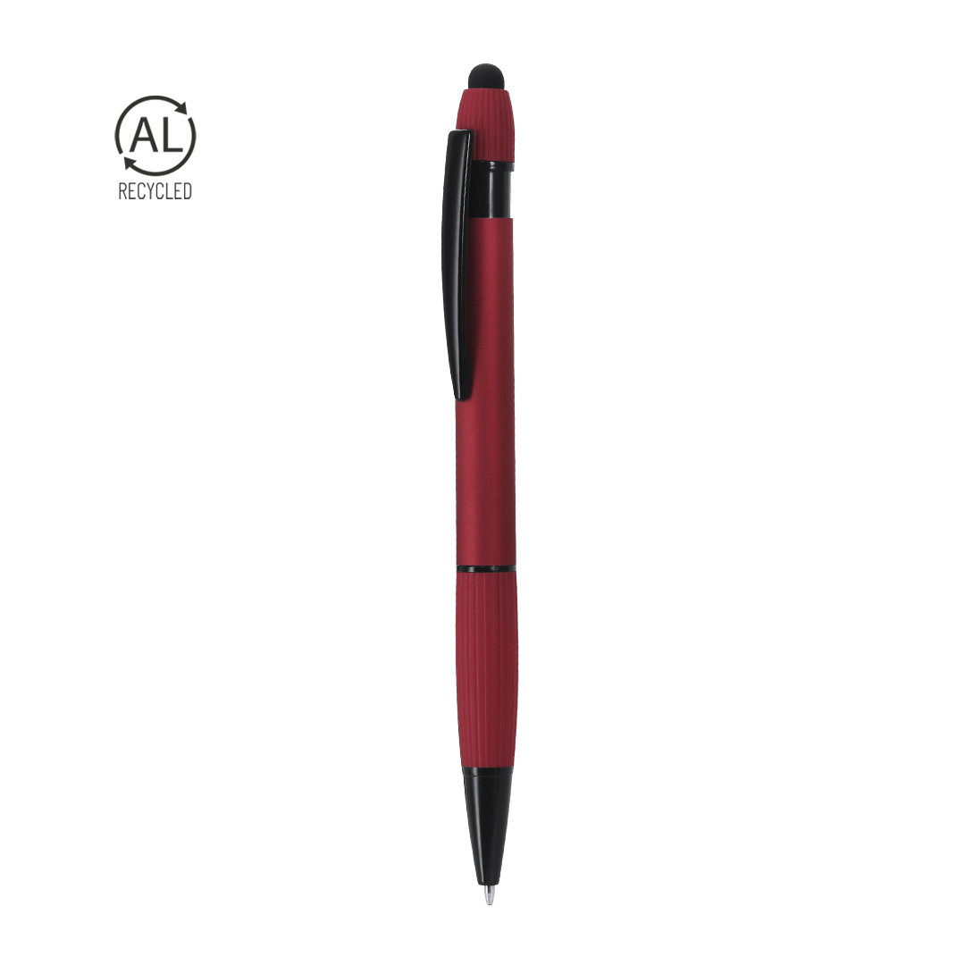 Bolígrafo puntero con cuerpo en Aluminio reciclado. Empuñadura de acabado gomoso. En la parte superior tiene un puntero negro. Clip metálico y accesorios en negros. En tinta azul.Distintivo aluminio reciclado en la parte superior del bolígrafo.
