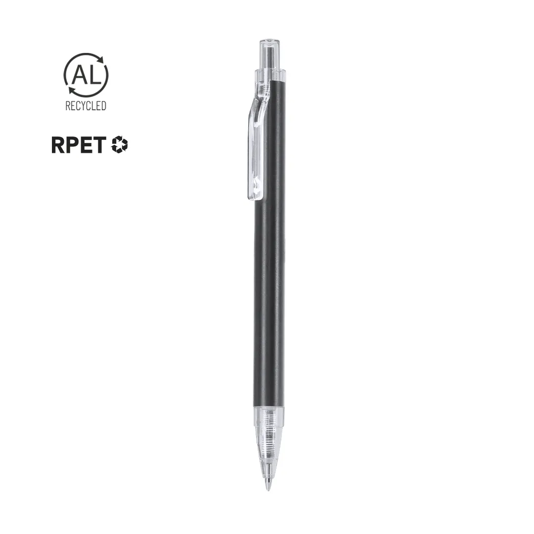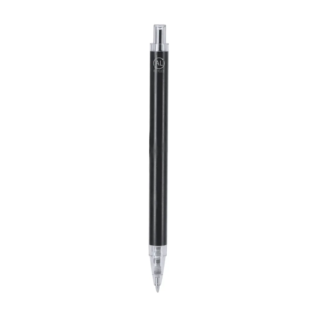 Bolígrafo con cuerpo en Aluminio reciclado. Clip, pulsador, punta en acabado transparente. Carga jumbo y en tinta azul. Incluye distintivo Aluminio reciclado.