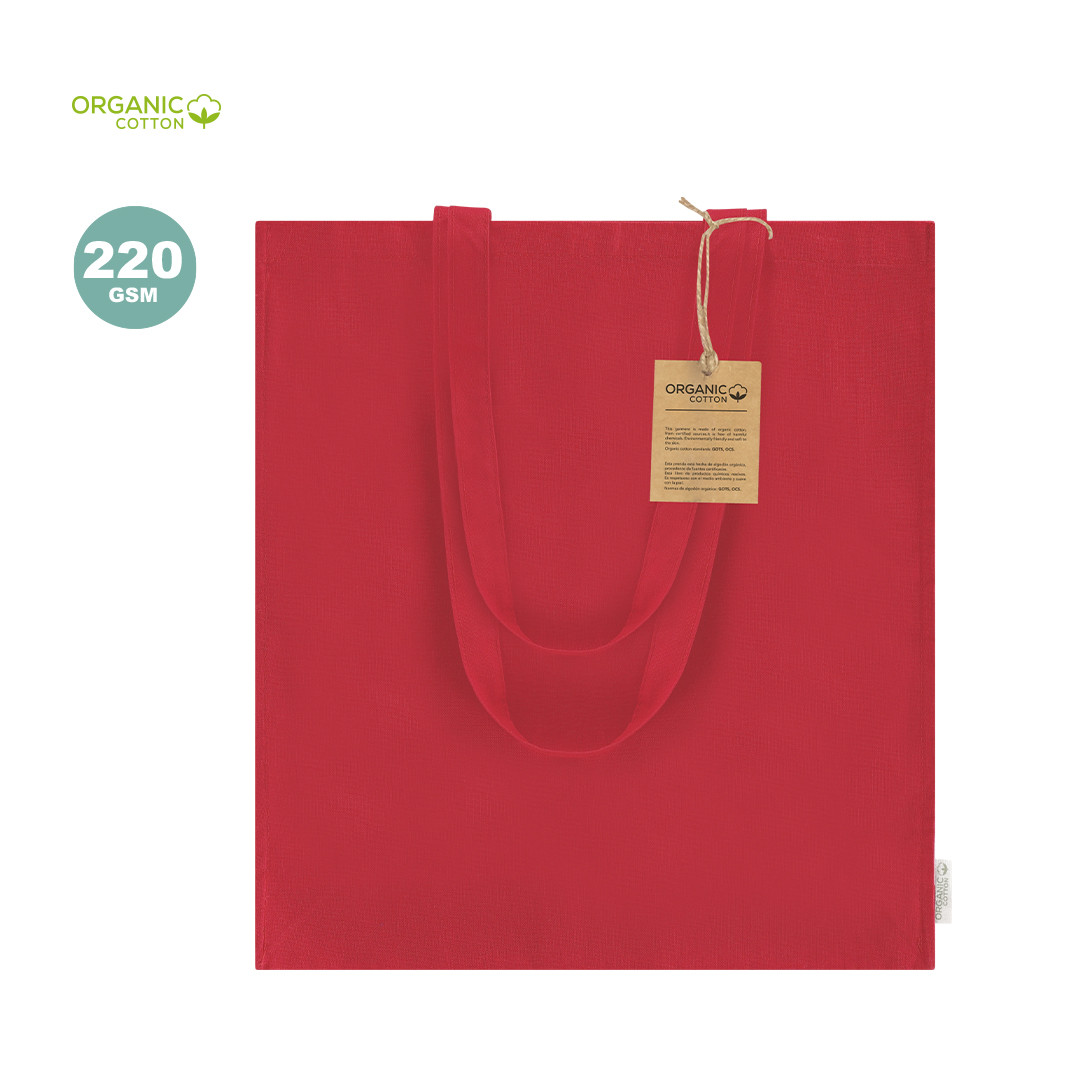 Bolsa confeccionada en algodón orgánico de 220 g/m2 con fuelle en base y laterales. Asas largas de 70cm con refuerzo, de acabado cosido. Logotipo en etiqueta lateral y resistencia hasta 10 kg de peso.