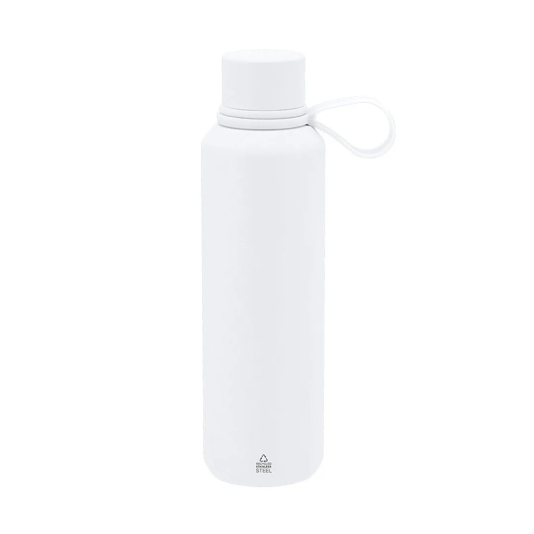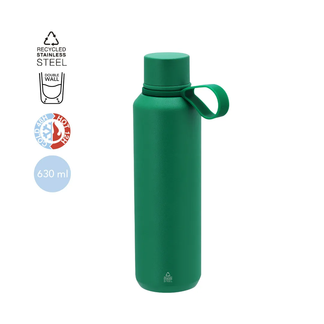 Bidón térmico de 630 ml de capacidad, fabricado en Acero Inox Reciclado de doble pared. Incluye asa de silicona a juego. Libre de BPA. Con distintivo acero inoxidable reciclado.