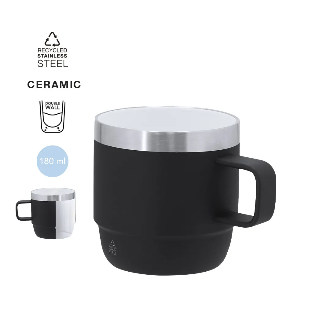 Taza fabricada en Acero Inox Reciclado de doble pared y 180ml de capacidad. Con doble pared para mejor y más duradera conservación de la temperatura e interior con recubrimiento de cerámica, apto para bebidas carbonatadas. Con distintivo de Acero Inox Reciclado.
