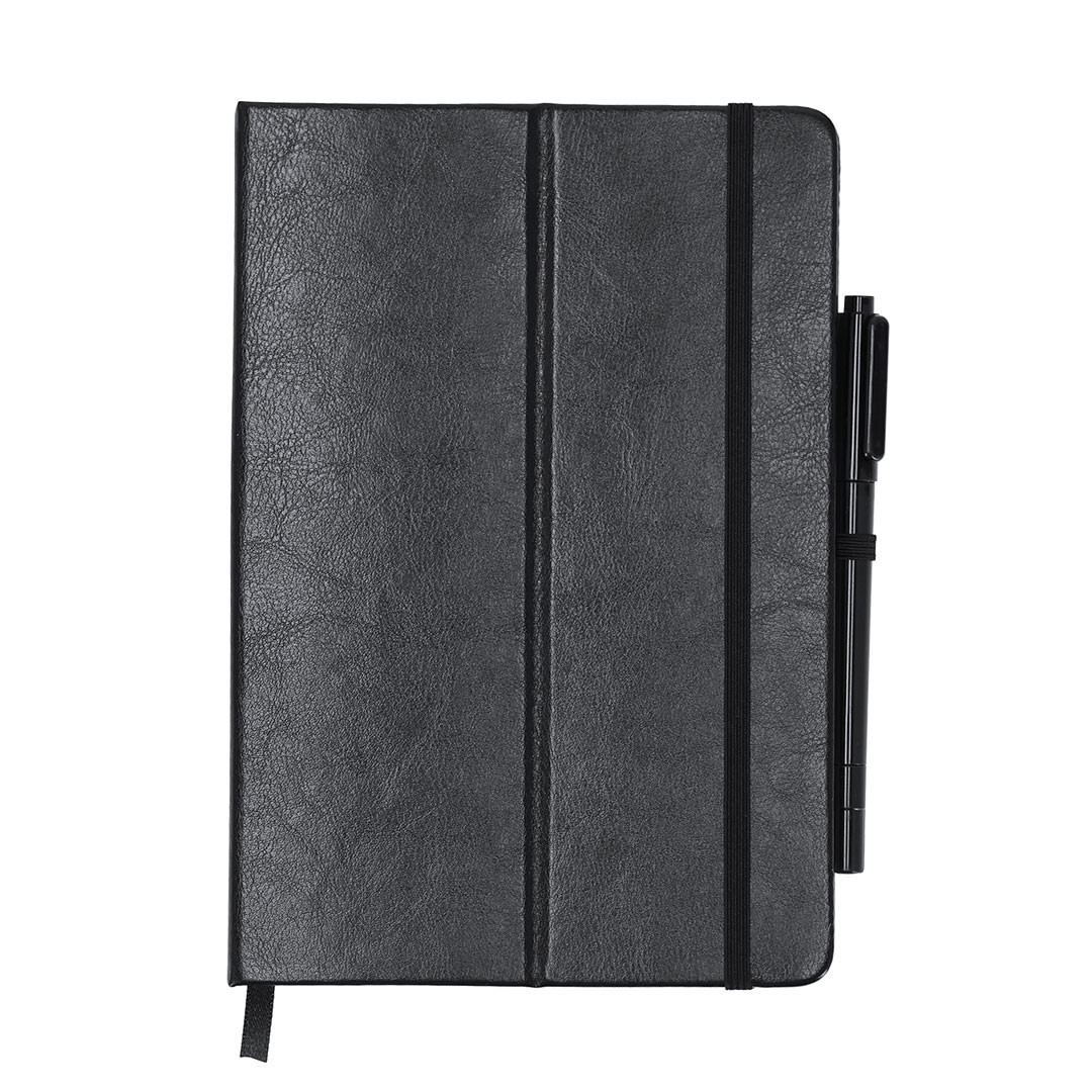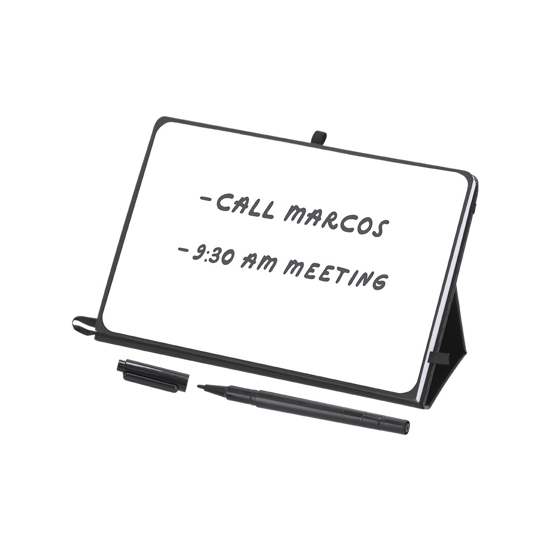 Bloc de notas pizarra en PU reciclado. Con pizarra en primera página, incluye bolígrafo rotulador y borrador en tinta negra. Con 80 hojas a disposición de una raya. Portada plegable con función soporte, y cinta elástica para cierre seguro.