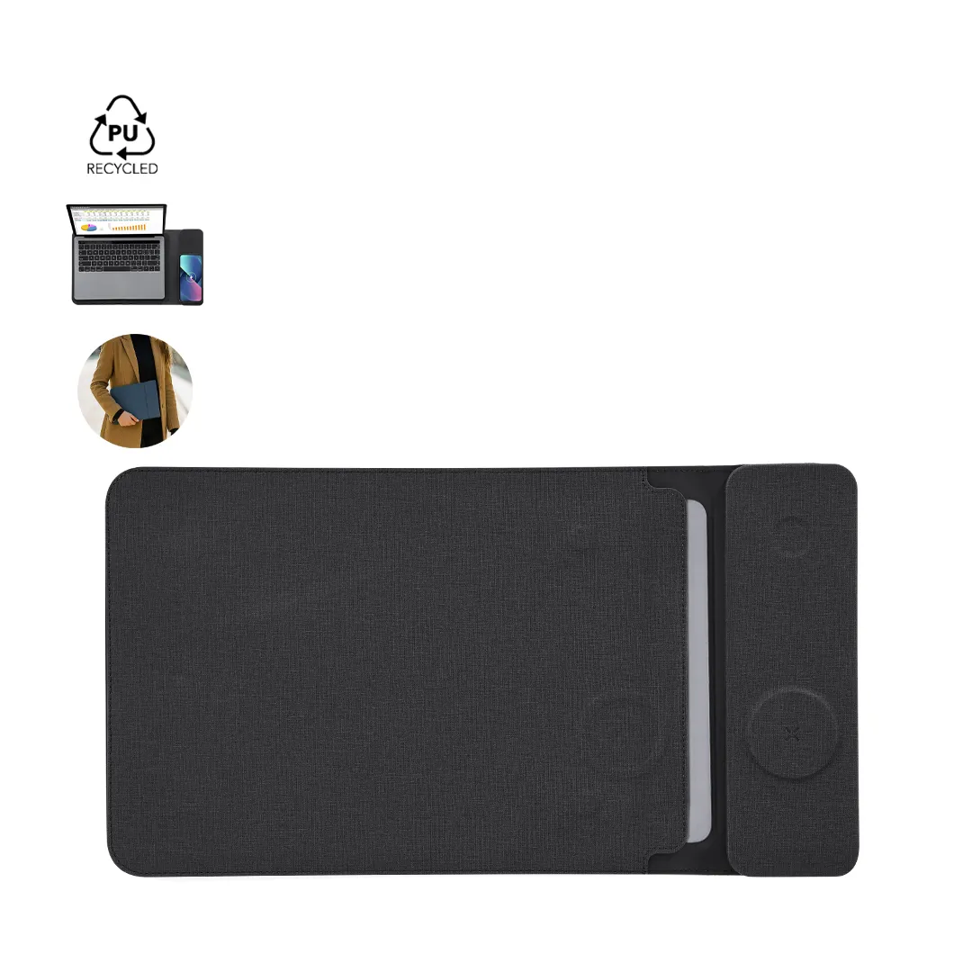 Funda de Ordenador Portátil Multifunción fabricada en PU Reciclado y tejido RPET. Para ordenadores de hasta 13 pulgadas y equipada con sistema de carga inalámbrica multifuncional.