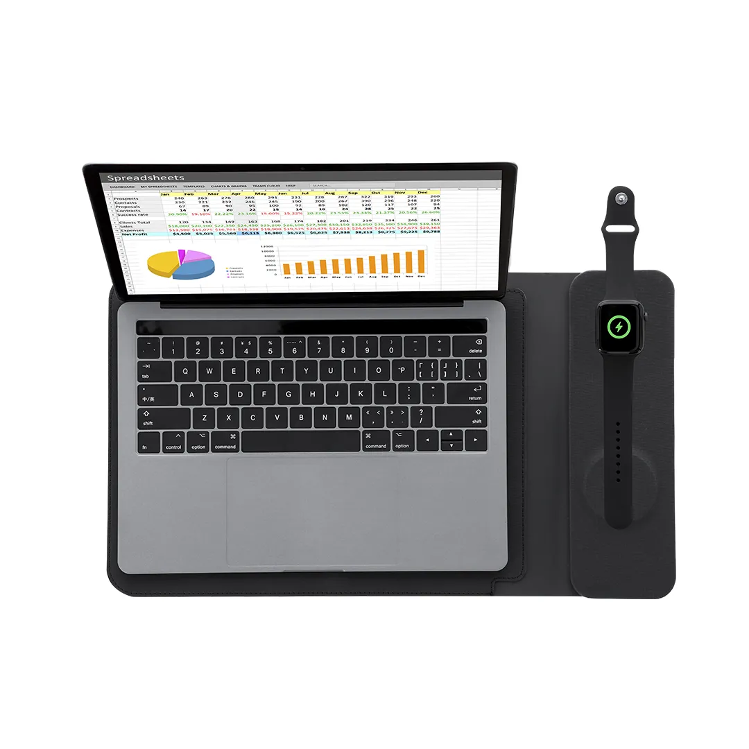 Incorpora 2 cargadores: cargador inalámbrico magnético para reloj inteligente, ubicado en la parte superior y, cargador inalámbrico magnético para móvil y/o auriculares en la parte inferior. Con sistema de cierre magnético.