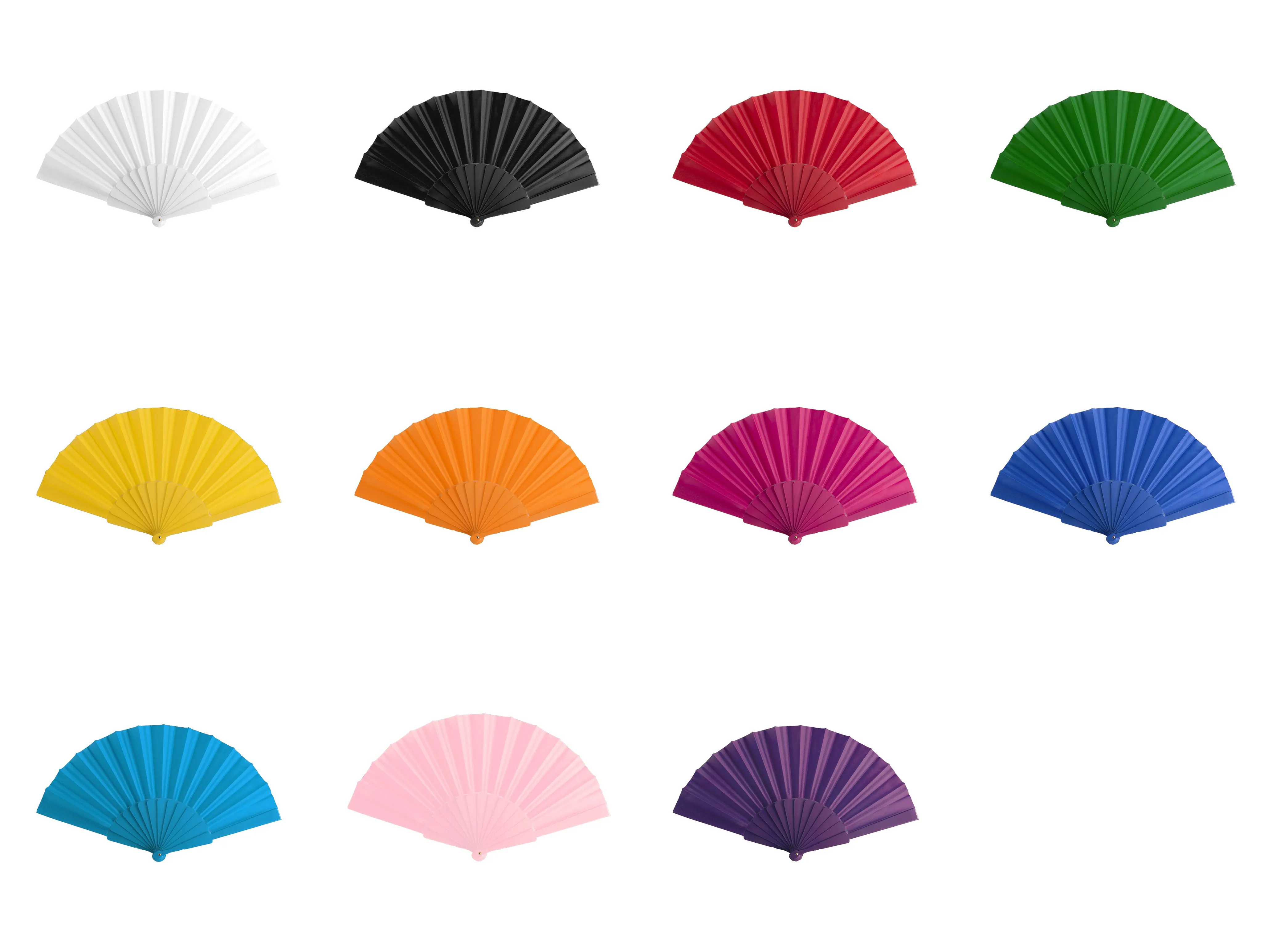 Abanico de varillas de plástico y tela en poliéster de variados colores. Presentado en caja individual con ventana.