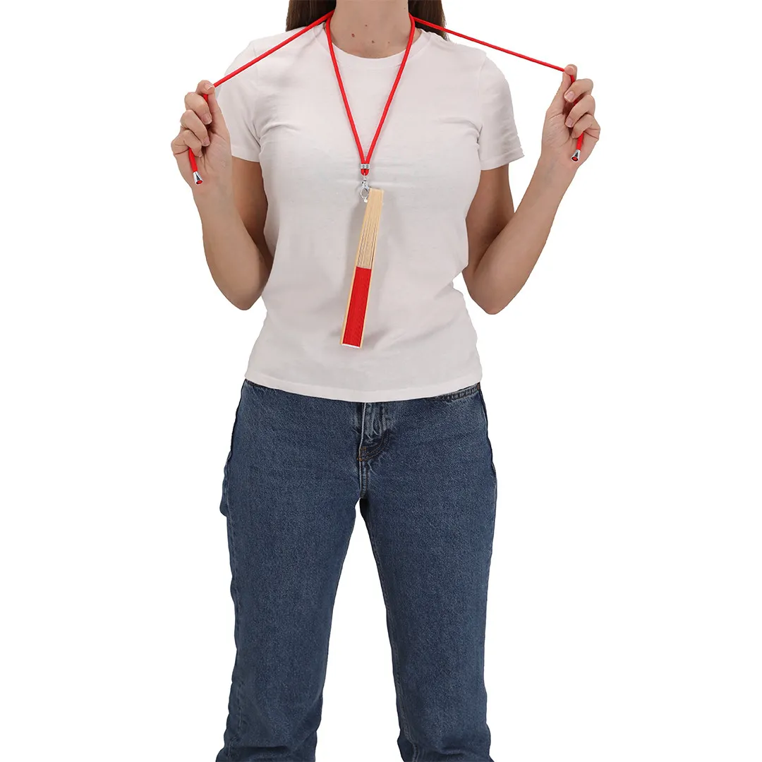 Abanico confeccionado con tela de resistente poliéster 190T y varillas de flexible bambú. Incluye un cordón ajustable a juego con la tela y un práctico mosquetón metálico para fácil transporte.