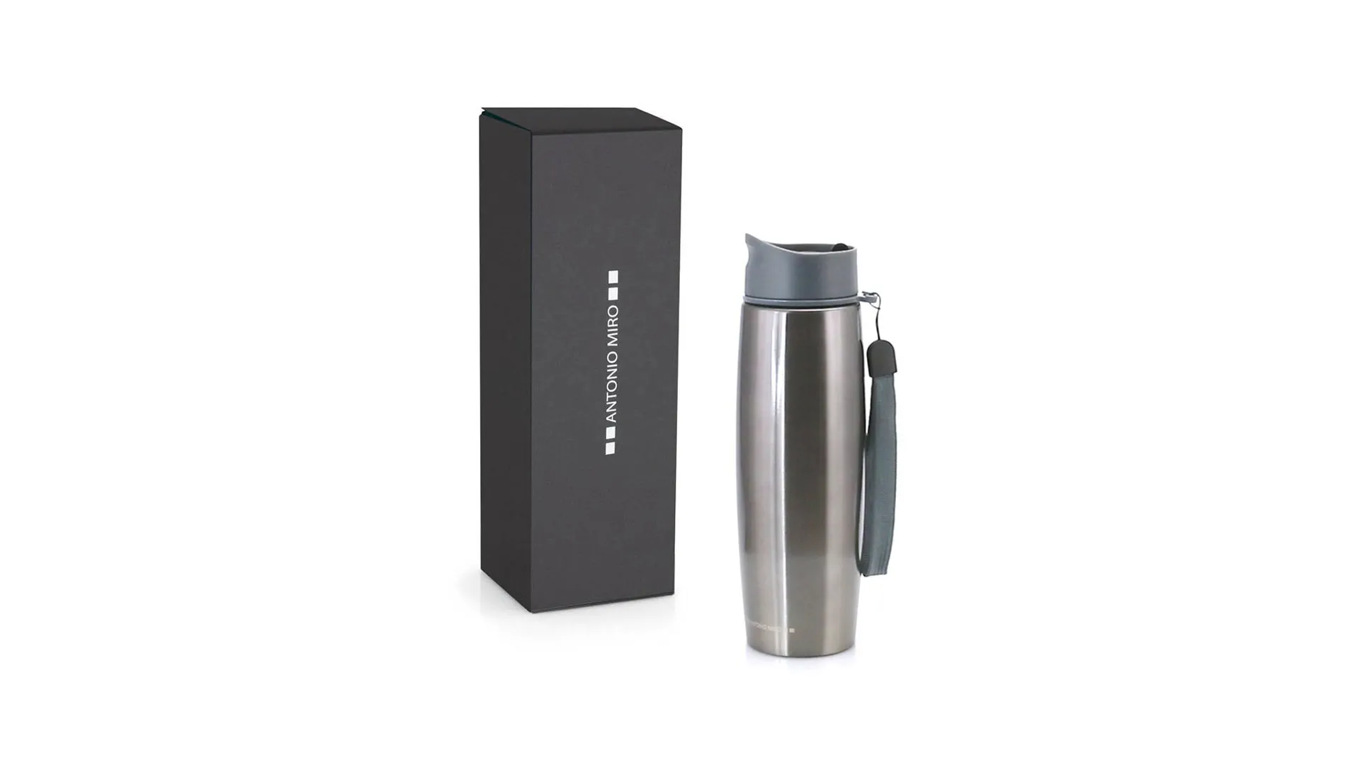 Bidón termo de Antonio Miró. En acero inox, de 500ml de capacidad con cuerpo metalizado en combinación con accesorios en sobrios colores. Con tapa dosificador de seguridad y presentada en caja individual con logotipo de la marca.