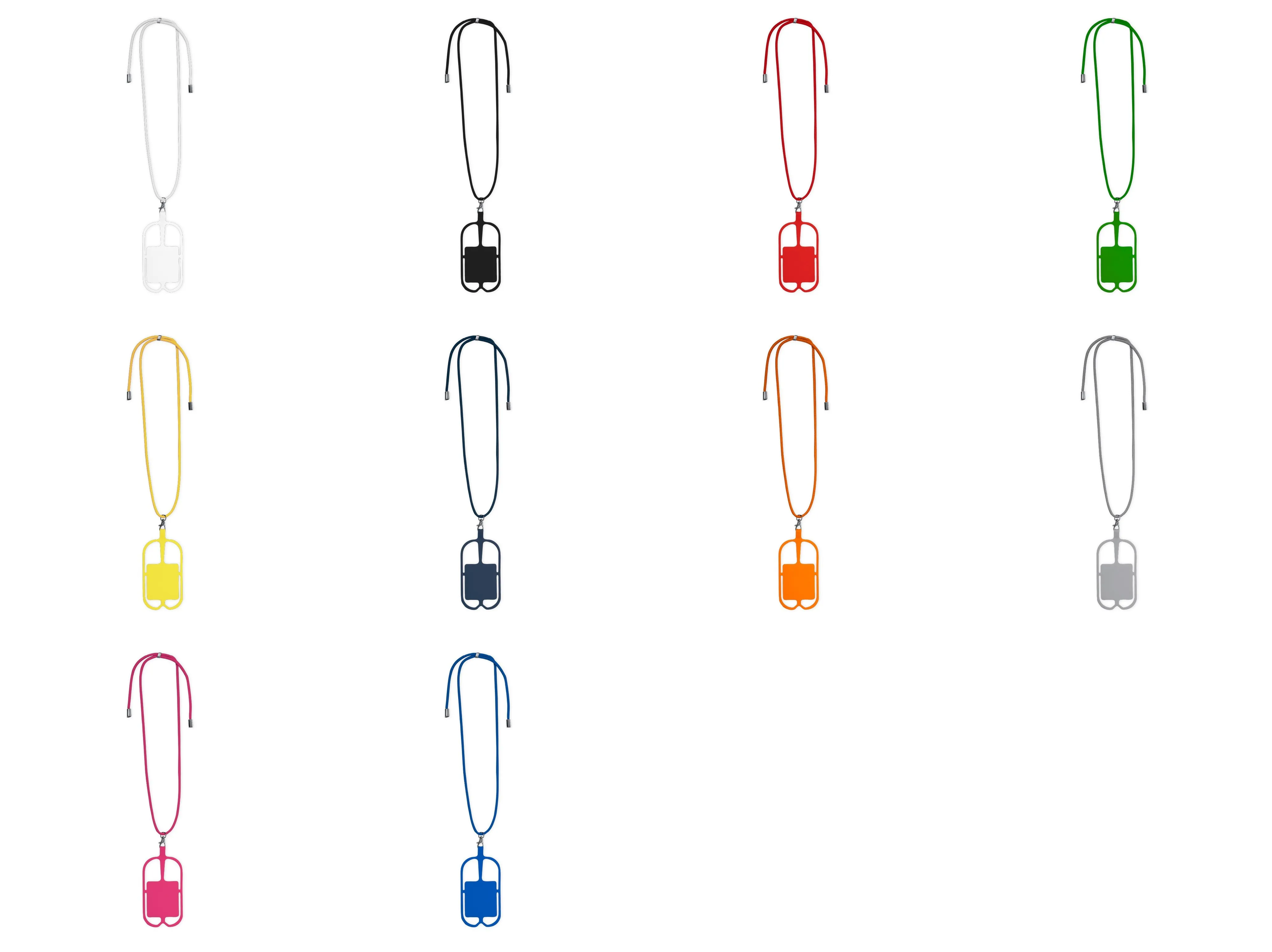 Original lanyard portamóvil en resistente poliéster y flexible silicona. Con accesorio de transporte para todo tipo de smartphones, capaz de ajustarse a todas las pantallas. Ajustador en cuello y extremos de cordones en acabado cromado. Incluye amplia zona de marcaje. Disponible en variada gama de colores.