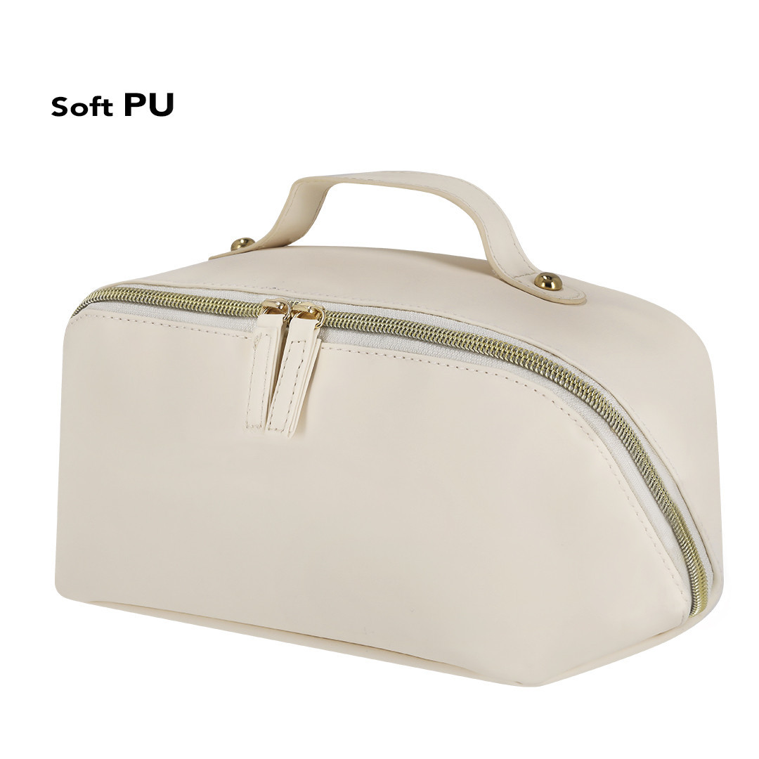 Neceser en suave PU, con compartimento principal de amplia apertura. Con tiradores de PU a juego y cremallera en color dorado. Interior con doble compartimento y bolsillo adicional con cremallera.