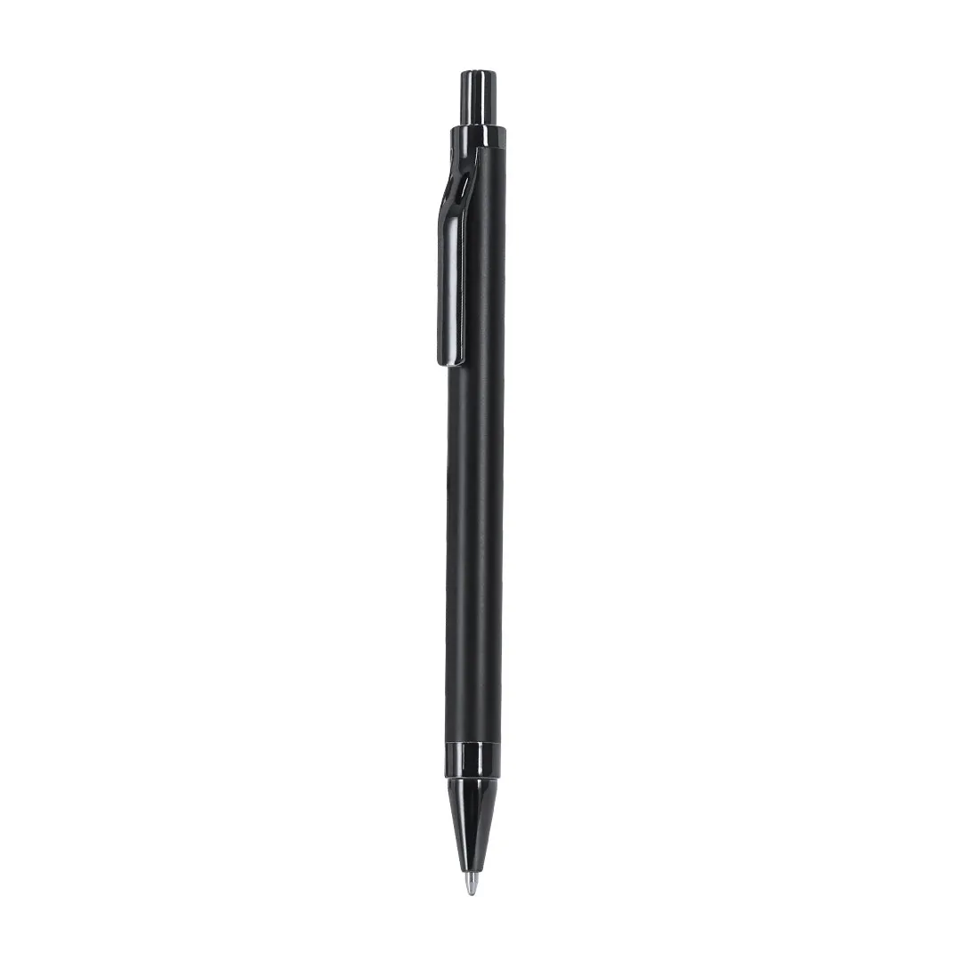 Bolígrafo en Aluminio Reciclado de acabado negro mate, de mecanismo pulsador y tinta azul. Con clip y puntera en pulido ABS. Incluye distintivo Aluminio reciclado.