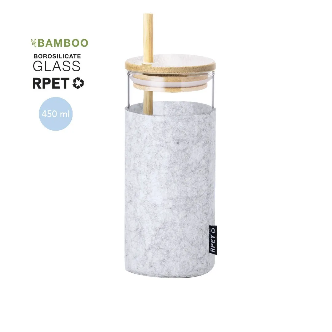 Cuerpo fabricado en cristal de borosilicato, libre de BPA, que ofrece una resistencia y durabilidad excepcionales, alargando su vida útil y pudiendo ser reutilizado infinidad de veces. Incluye funda en suave y sostenible fieltro RPET, tapón de bambú a presión con orificio para pajita, y pajita reutilizable de bambú. Con etiqueta distintiva RPET. Presentado en caja individual de diseño eco.