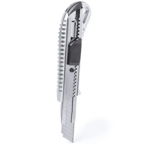 Cutter en combinación de materiales acero inox y aluminio con cuchilla ancha y mango ergonómico troquelado. Capucha extraíble para ajuste de corte de cuchilla.