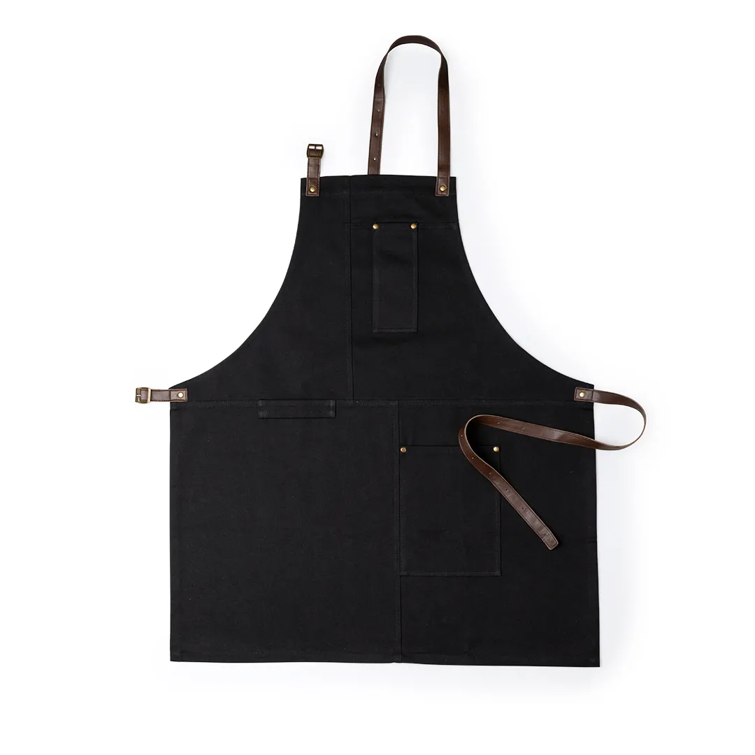 Delantal pro de alta calidad en resistente algodón canvas de 340g/m2. De corte por debajo de la rodilla, con cintas de cuello y cintura en resistente polipiel con ajuste mediante hebilla y reforzado con remaches metálicos. Incluye multitud de bolsillos para los distintos utensilios, con las costuras reforzadas.