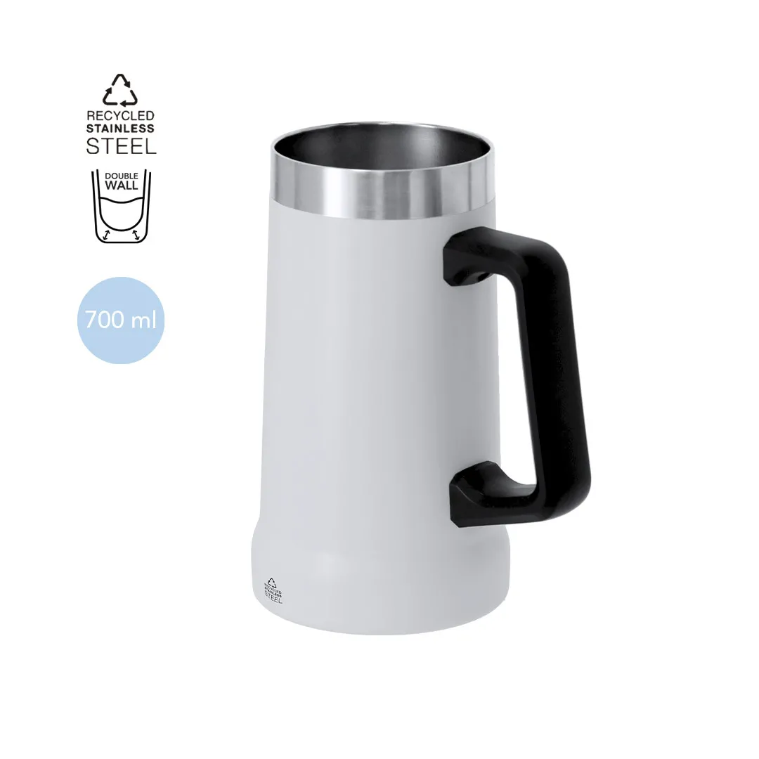 Jarra de 700ml de capacidad fabricada en Acero Inox Reciclado de doble pared. De diseño bi color, con asa de transporte negra ergonómica para mayor comodidad en resistente PP. Libre de BPA. Distintivo de Acero Inox Reciclado marcado.