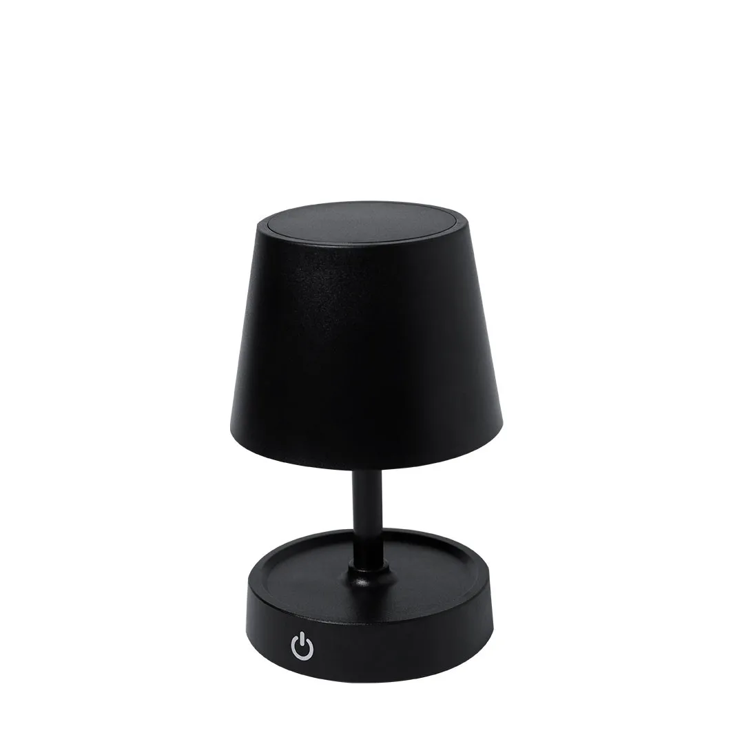 Lámpara de diseño en acabado negro mate. Incluye sistema de regulación de intensidad de luz táctil y con cuerpo plegable para ajustarlo en altura. Equipada con batería de 800mAh recargable por USB Tipo C -cable incluido- y 12 LEDs de luz cálida. Con botón encendido/apagado en la parte trasera.