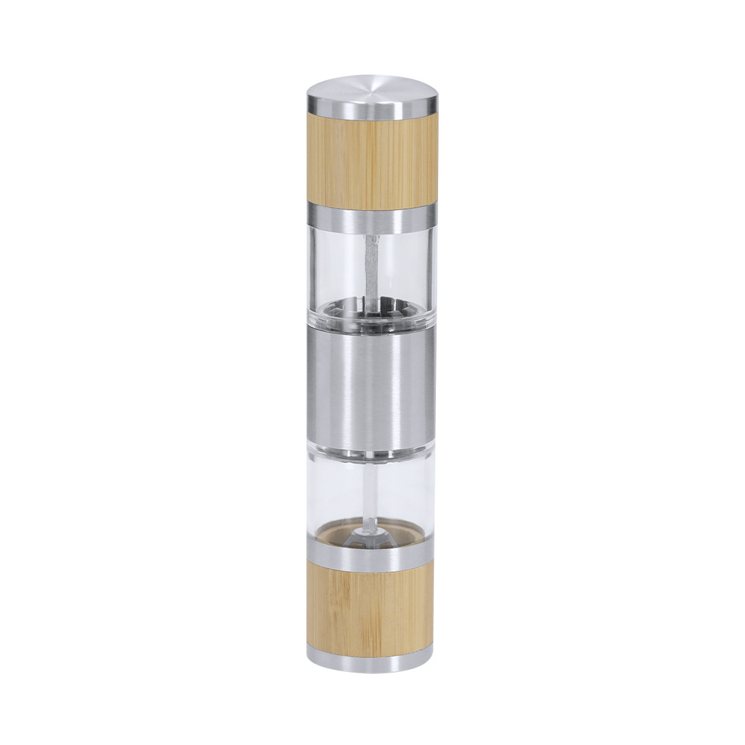 Molinillo manual para sal y pimienta fabricado en Bambú y Acero Inoxidable. Incluye dos compartimentos separados para sal y pimienta, cada uno con molinillo cerámico interno y ajuste manual de grosor. Cuenta con una ventana para visualizar el nivel.