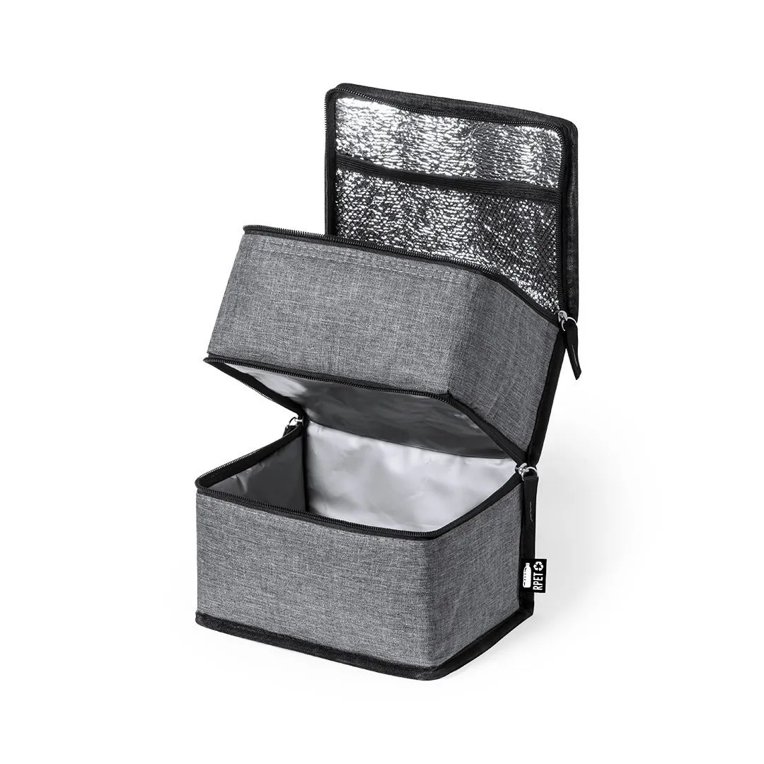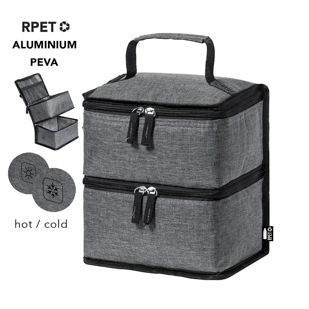 Práctica nevera de línea nature y doble compartimento fabricada en poliéster 600D RPET de alta calidad, elaborado a partir de plástico reciclado para así fomentar la reutilización de residuos plásticos y contribuir a la sostenibilidad del planeta. Asa de transporte reforzada, incluye 2 compartimentos con cierre de cremallera y doble tirador de tela, con distintivo RPET en etiqueta exterior: