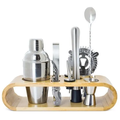 Nuevo set, contiene una coctera (350 ML) un dosificador de doble medida, un colador, un mortero, una cuchara, dos vertidores, un sacacorchos, una pinza de hielo todo presentado en un soporte de bambú.