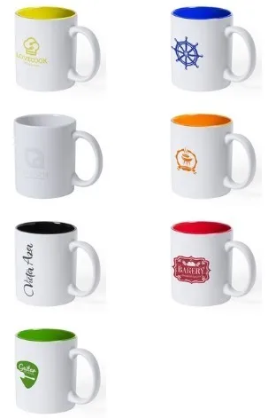 Taza de cerámica de alta calidad de 350ml de capacidad. Parte exterior en color blanco, especialmente diseñada para marcaje en láser, e interior en vivos colores. Al grabar el logotipo en la parte exterior, se muestra el color del interior de la taza. Presentada en caja individual.