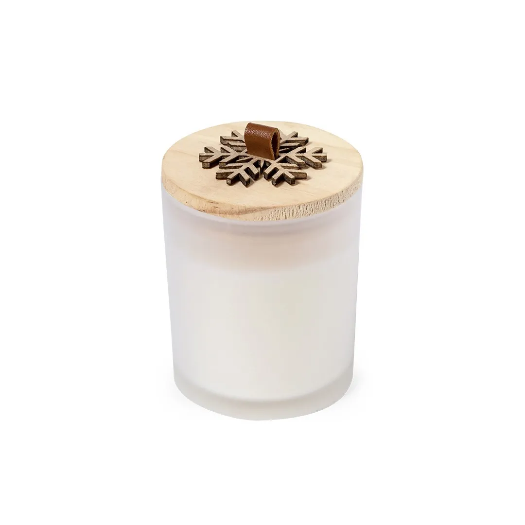 Vela de diseño navideño con aroma vainilla. Fabricada en cristal, con tapa de madera pulida y relieve diseñado en forma de copo de nieve.