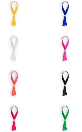 Pulsera ajustable en suave poliéster y amplia gama de colores. Con accesorio de ajuste en color plateado brillante.