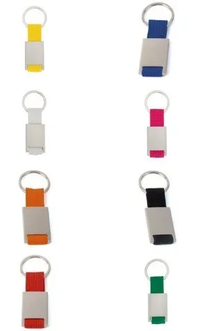 Llavero de divertido diseño con cinta de poliéster de variados y vivos colores. Con cuerpo metálico especialmente diseñado para marcaje en láser.