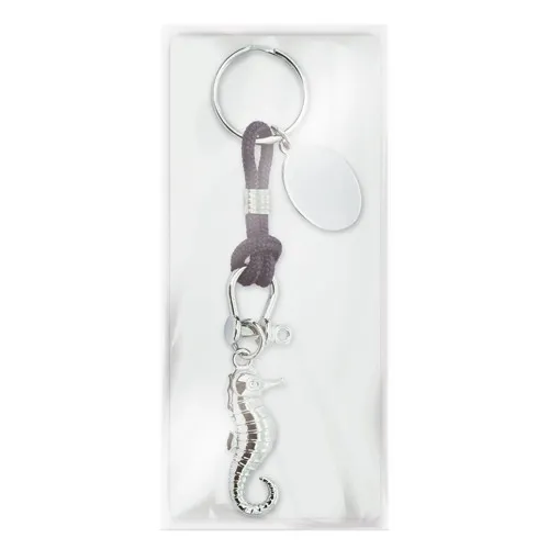 Llavero caballito de mar plateado, incluye una cuerda detalle azul.