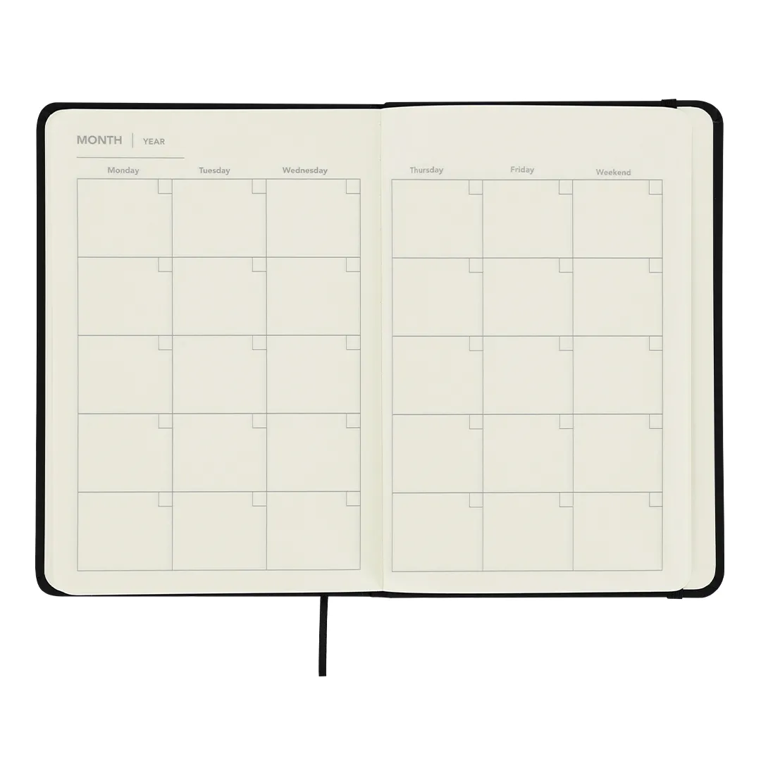 Bloc de notas con planificador mensual incluido. Elaborado en suave PU, con banda elástica a tono. Incluye: