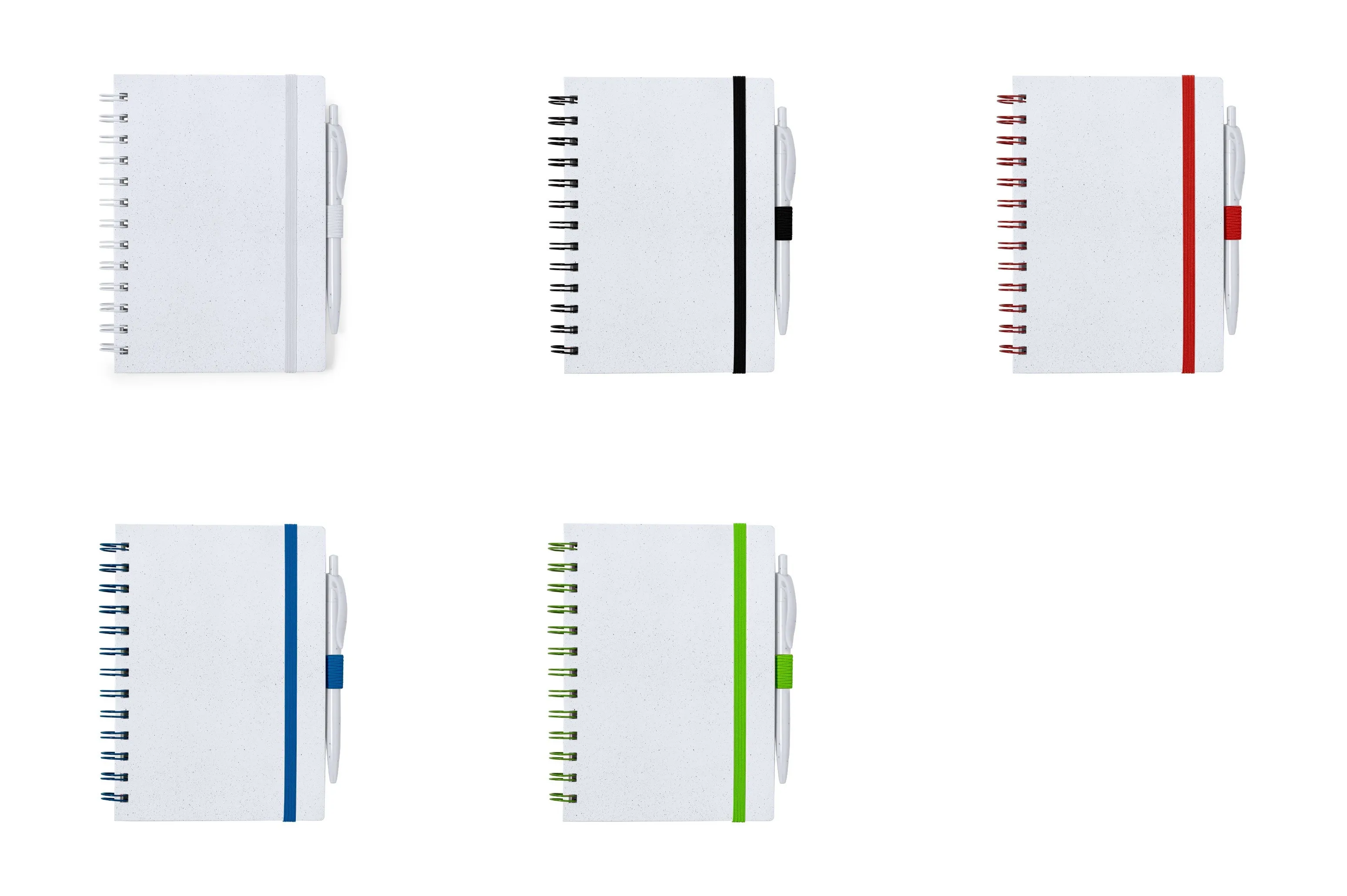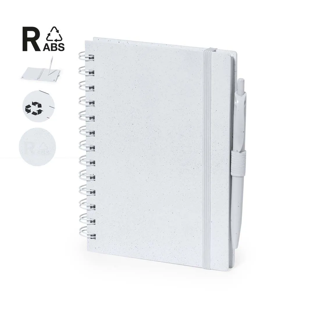 Libreta de anillas con tapas rígidas fabricadas en RABS y bolígrafo a juego. De tamaño A5, con elástico de cierre elegante disponible en amplia variedad de colores. Interior con 70 hojas blancas con disposición a una raya. Bolígrafo de mecanismo pulsador en RABS con tinta azul. Incluyen distintivo RABS. Presentado en bolsa individual reciclada.