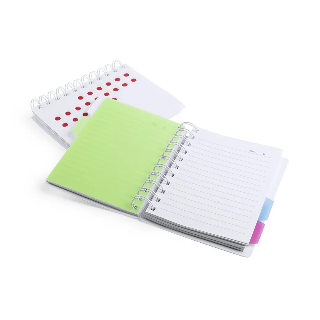 Bloc de notas adhesivas de anillas con tapas de suave tacto acabadas en resistente cartón reciclado rígido. Con 75 notas adhesivas grandes y 125 mini notas adhesivas.