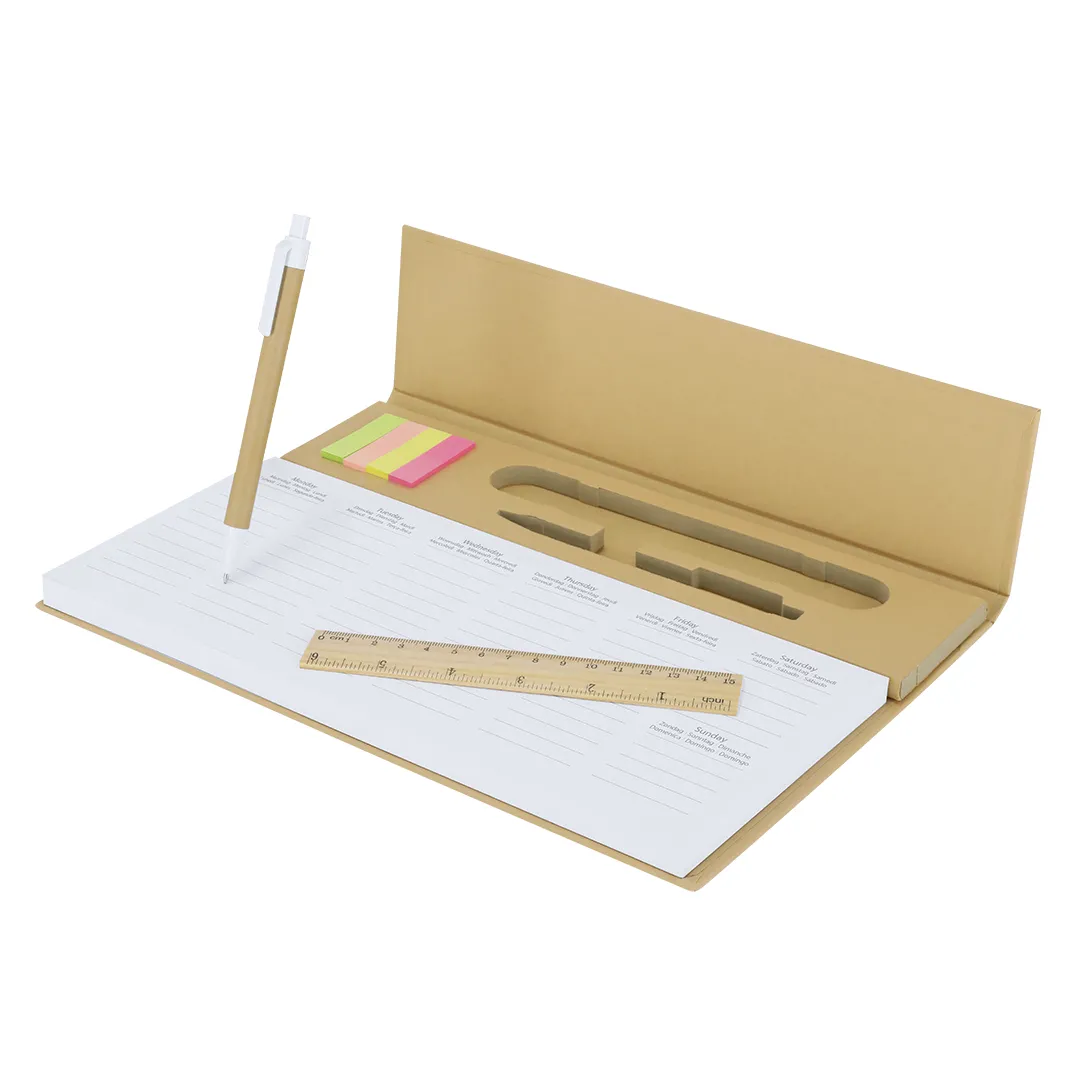 125 Hojas. 7 Idiomas. 100 Mininotas Adhesivas 1,2 x 4,5 cm. Bolígrafo Cartón Reciclado y Regla Madera Incluida