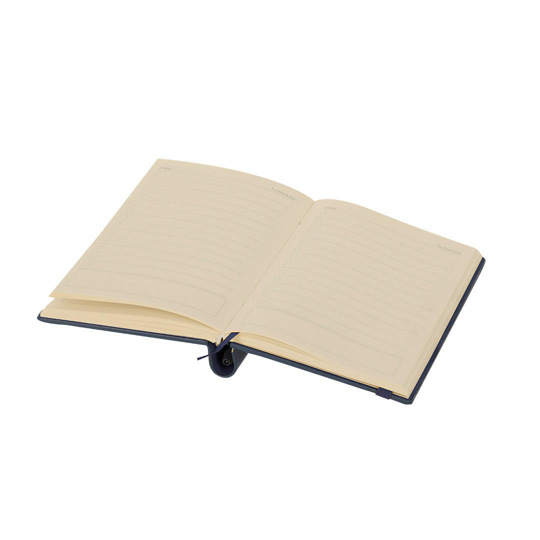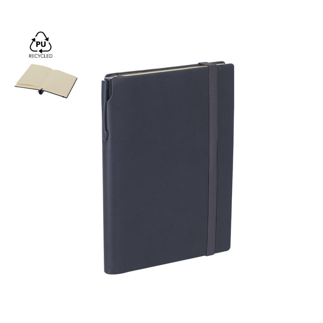 - Bloc de notas fabricado en PU reciclada. Portadas rígidas, incluye 96 páginas de color crema, marcapáginas y cinta elástica de cierre a juego. Con distintivo logo PU reciclado.
