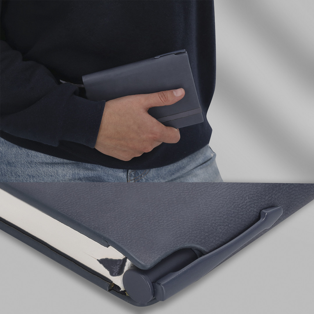El bloc dispone de un espacio para guardar el bolígrafo pudiendo llevarlo todo en un mismo sitio.