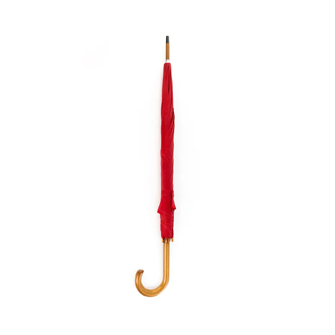 Paraguas de 8 paneles confeccionado en poliéster. De 105cm de diámetro, con apertura manual, varillas metálicas en color negro y cierre de velcro. Palo y mango fabricados en suave madera de color natural, con tela en variada gama de vivos colores.