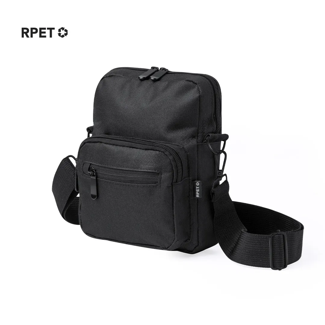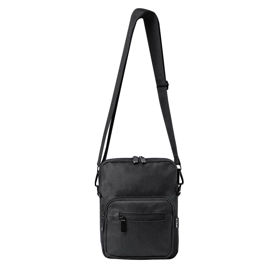 Bandolera confeccionada en poliéster RPET 600D, cuenta con un bolsillo central de cremallera, y doble tirador, con dos compartimentos frontales de rápido acceso con cierre de cremallera. Equipada con una cinta ajustable para mayor comodidad y una etiqueta distintiva de RPET. Presentada individualmente en bolsa reciclada.