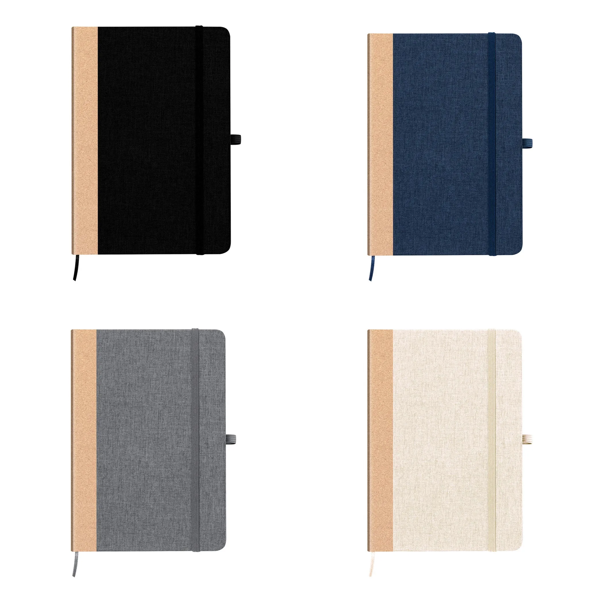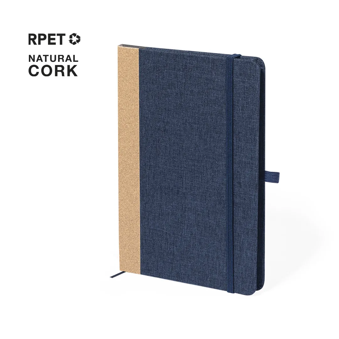 Bloc de notas con tapas rígidas fabricadas en RPET, con el lomo en corcho. Incluye interior con 80 hojas lisas, marcapáginas, elástico de cierre y soporte para bolígrafo a juego. logotipo RPET en contraportada y disponible en elegantes colores. Presentado en una bolsa individual de papel reciclado.