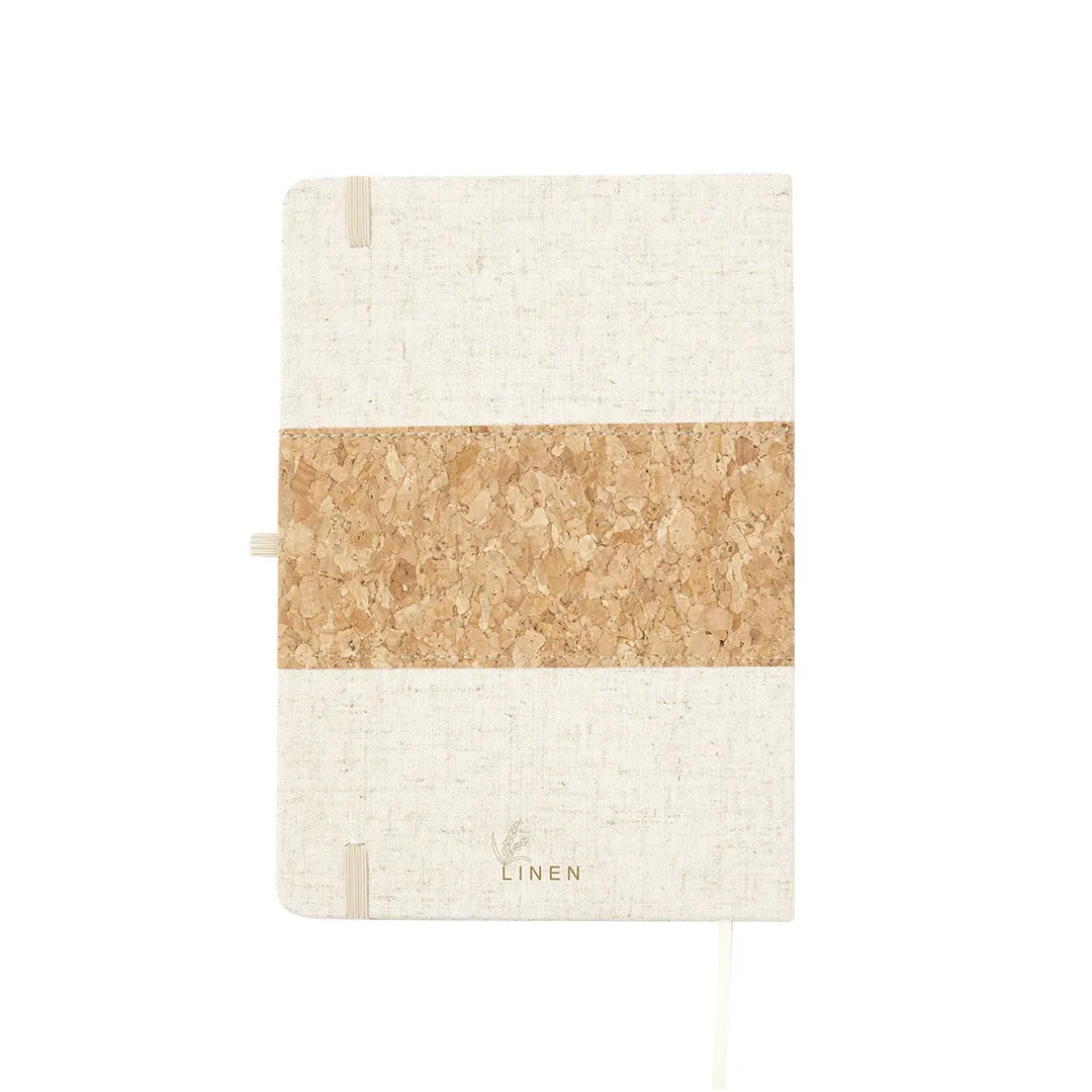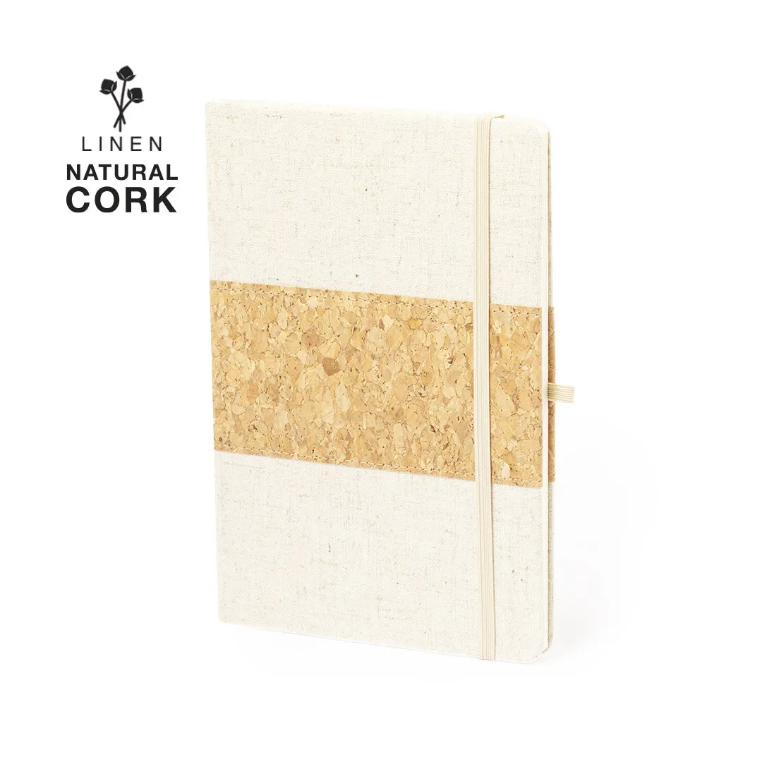 Bloc de notas de tapas exteriores confeccionadas en corcho y lino. De tapas rígidas, con soporte para bolígrafo, marcapáginas y 80 hojas lisas color natural. Presentado en bolsa individual.