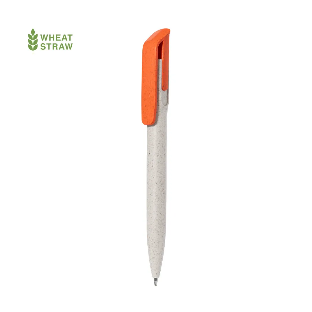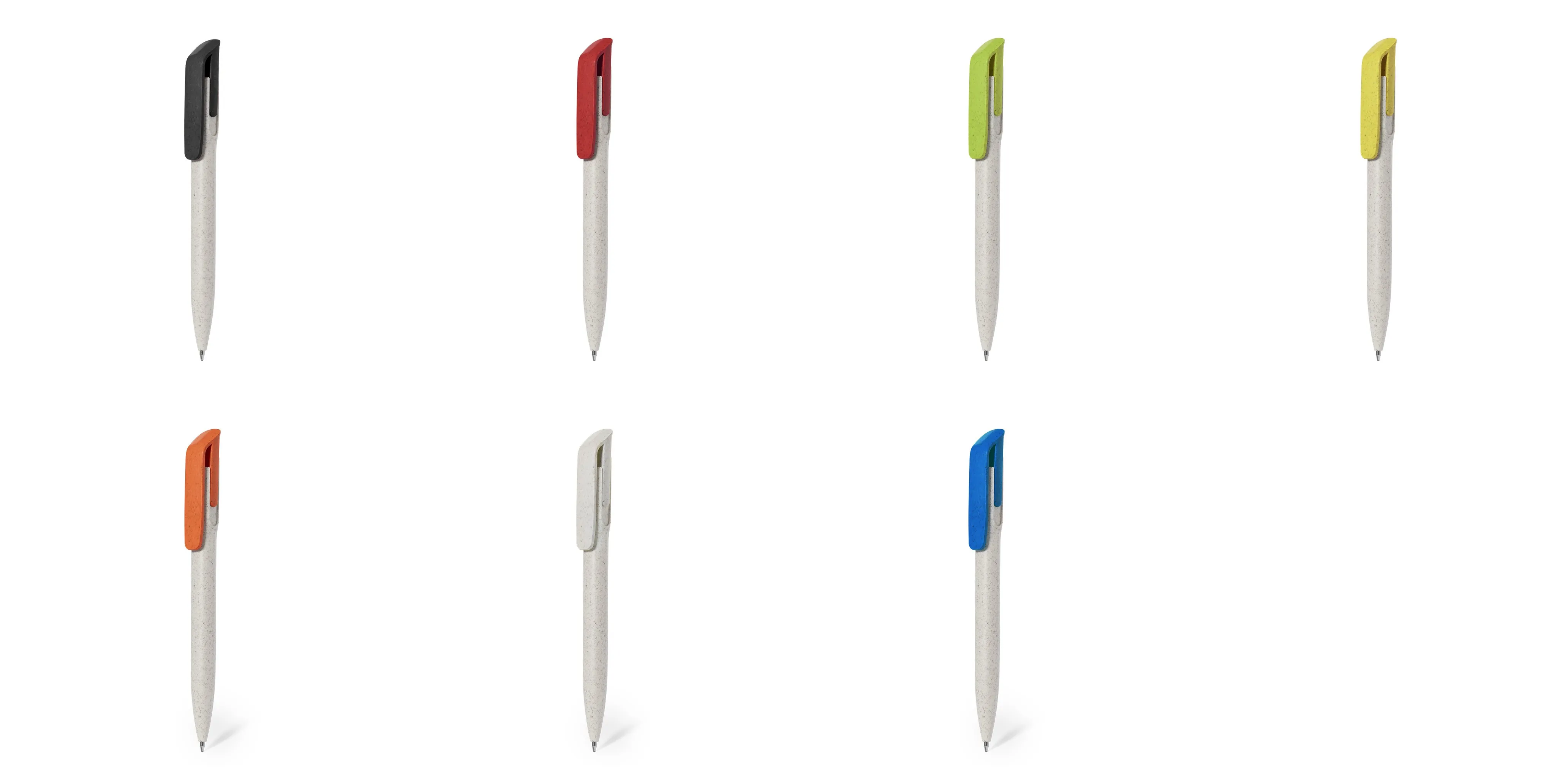 Práctico bolígrafo fabricado en caña de trigo. De mecanismo pulsador, en tinta azul y con logotipo Wheat Straw en la parte superior del bolígrafo. Con clip en variada gama de colores y cuerpo natural.