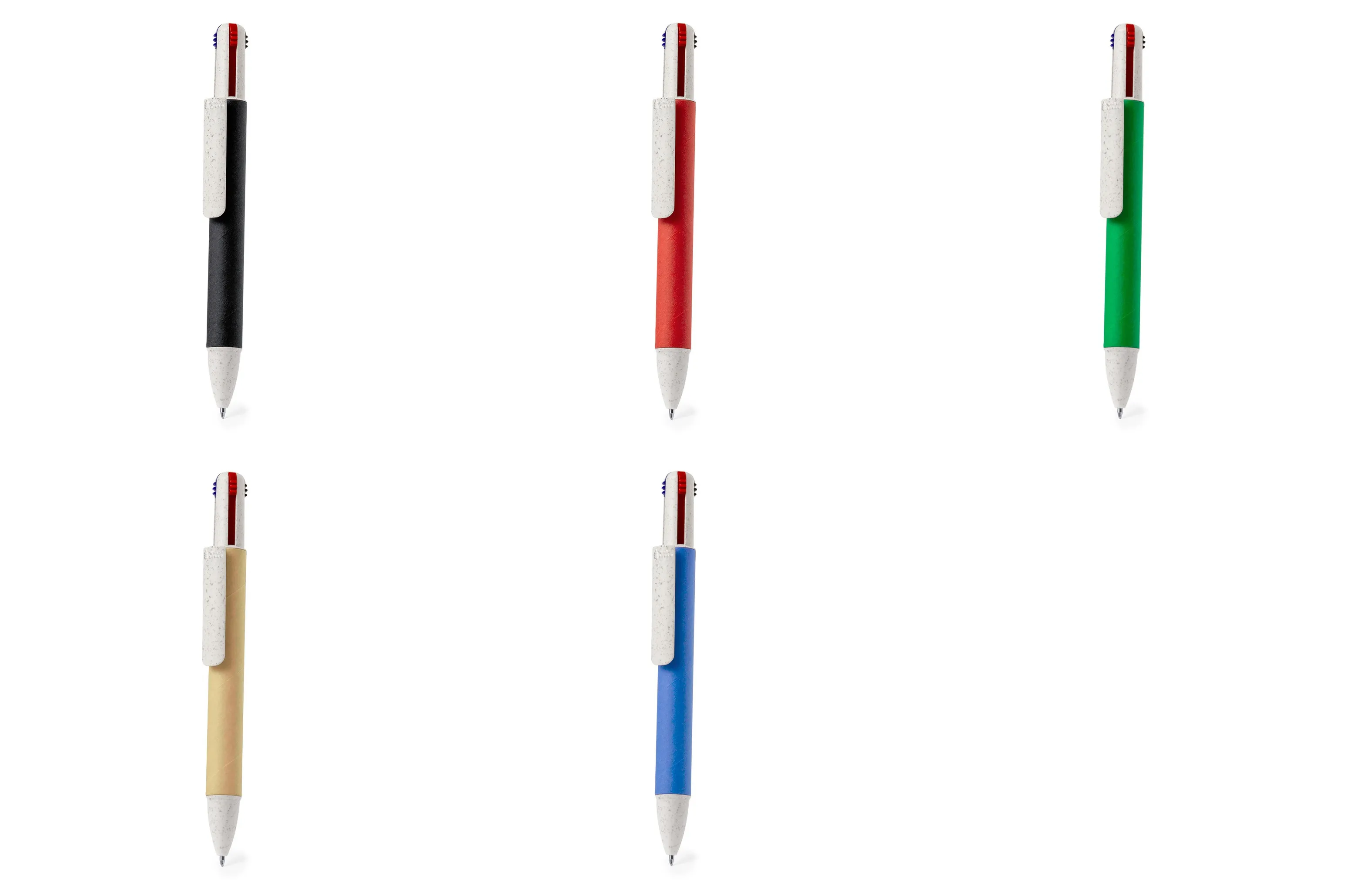 Bolígrafo 4 en 1 con mecanismo pulsador retráctil. Combinación de cuerpo en cartón reciclado natural y accesorios en caña de trigo y ABS, para fomentar la utilización y reciclado de materias primas, reduciendo así las emisiones contaminantes. De 4 cartuchos en tinta azul, roja, negra y verde.