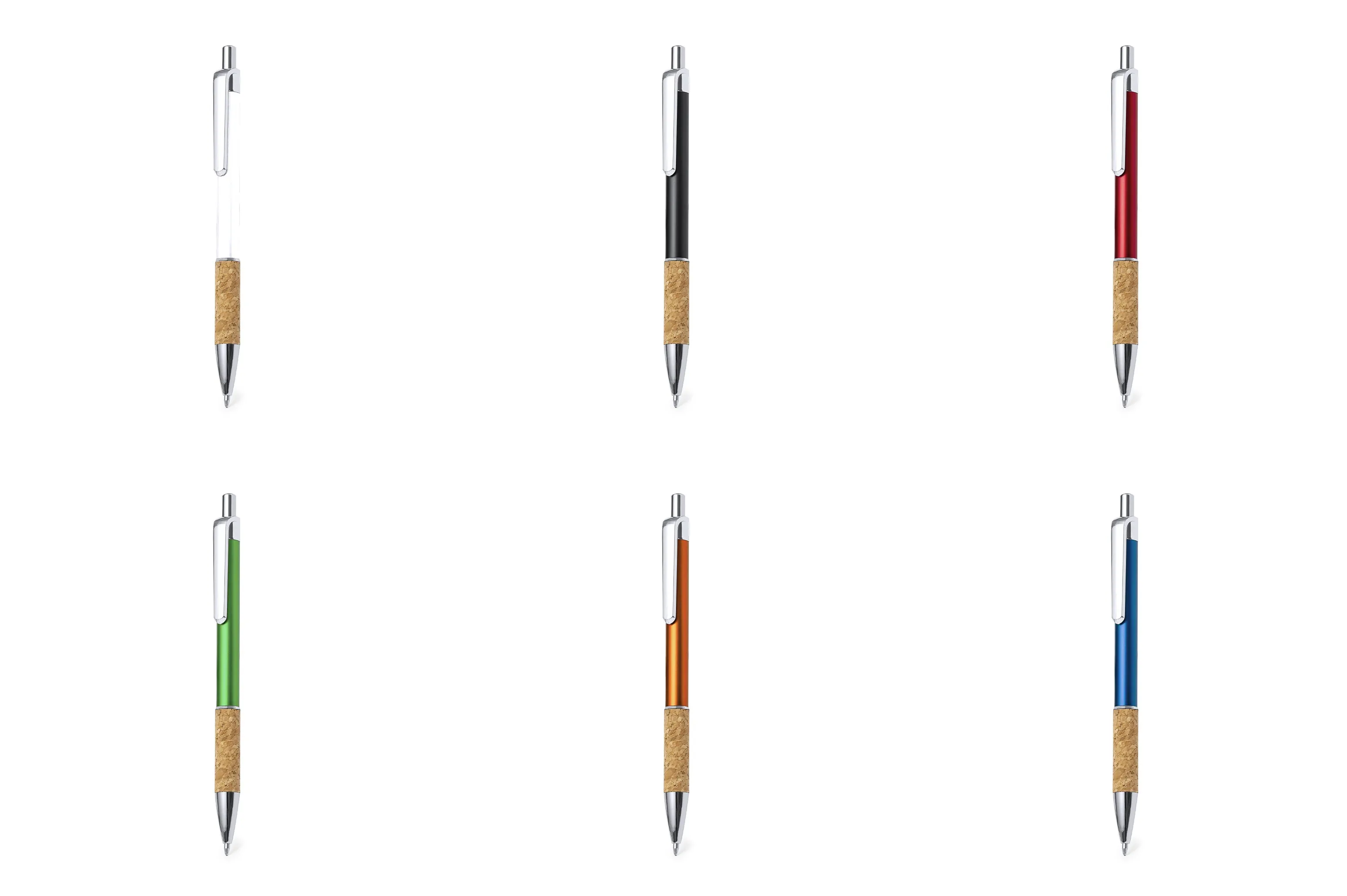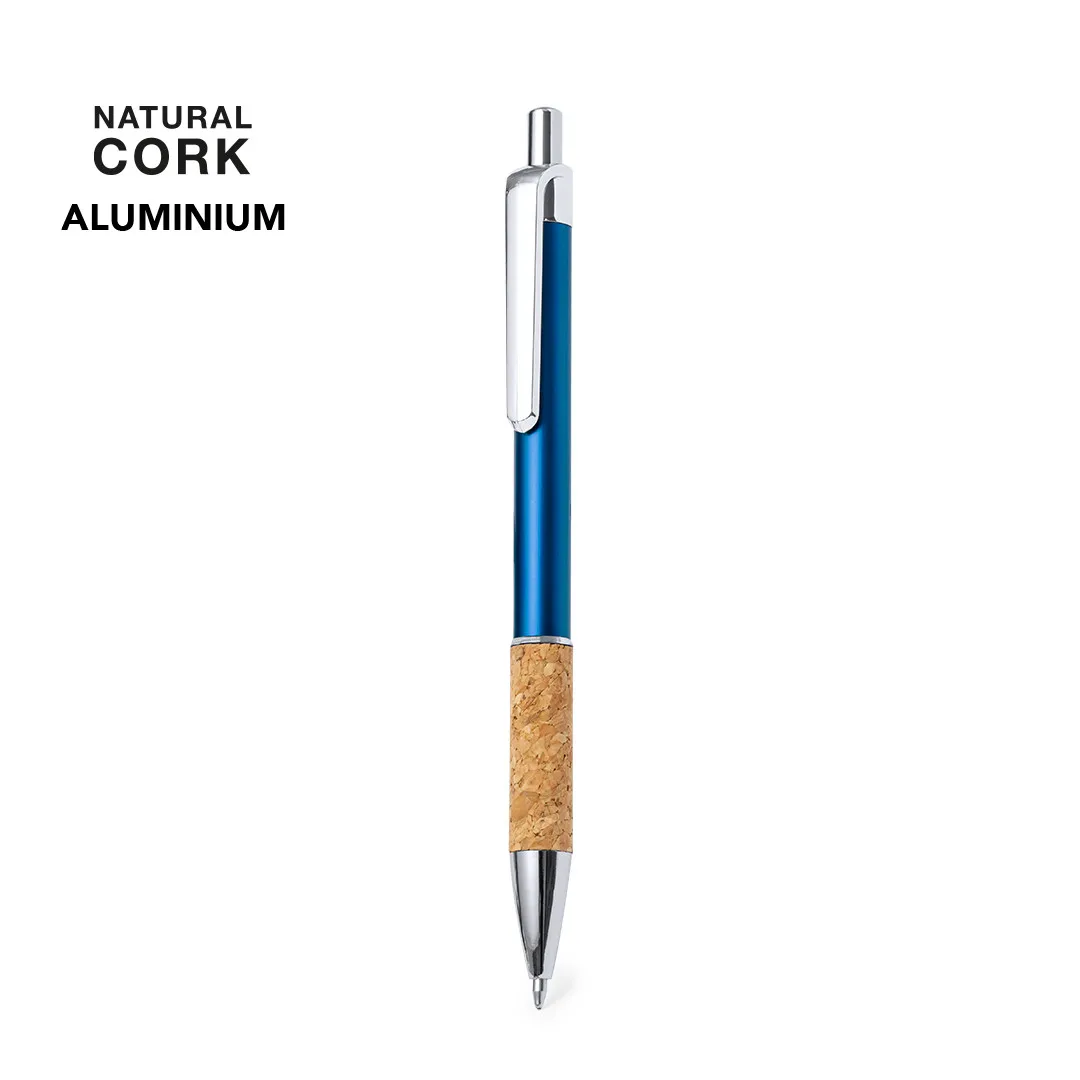 Elegante bolígrafo de corcho y aluminio con mecanismo pulsador. Cuerpo en resistente aluminio de acabado brillante y empuñadura en corcho, con la caña en una amplia gama de distintivos colores. Clip metálico, y en tinta azul. Presentado en bolsa individual reciclada.