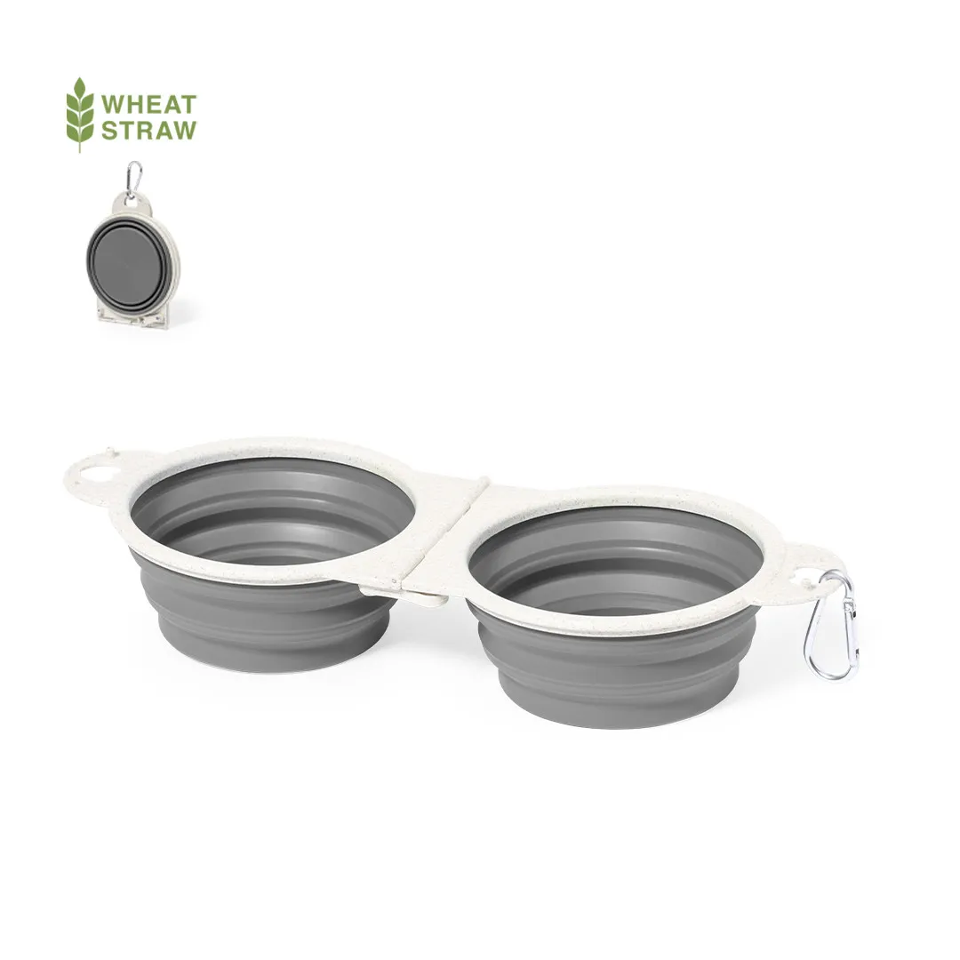 Bowl plegable para mascotas fabricado en caña de trigo. De diseño compacto, con dos compartimentos y perfecto para usar en cualquier sitio. Incluye práctico mosquetón de transporte de fácil enganche. Presentado en una bolsa individual reciclada.