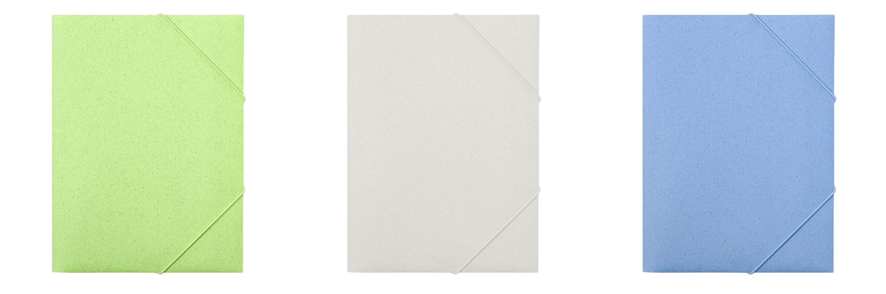 Carpeta fabricada a partir de caña de trigo. Tapa flexible, con interior especial para sujetar los folios y banda elástica de cierre. Disponible en varios colores.