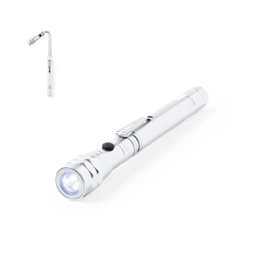 Linterna de aluminio práctica y versátil, con cabezal extensible (triplicando su longitud) y flexible para llegar a todos los lugares, además está equipado con imanes adaptándose a diversas necesidades. Cuenta con 3 potentes LEDs para una iluminación eficiente. Funciona con pilas de botón incluidas y presenta un clip metálico para facilitar su sujeción. Se presenta de manera individual en una caja de diseño kraft.