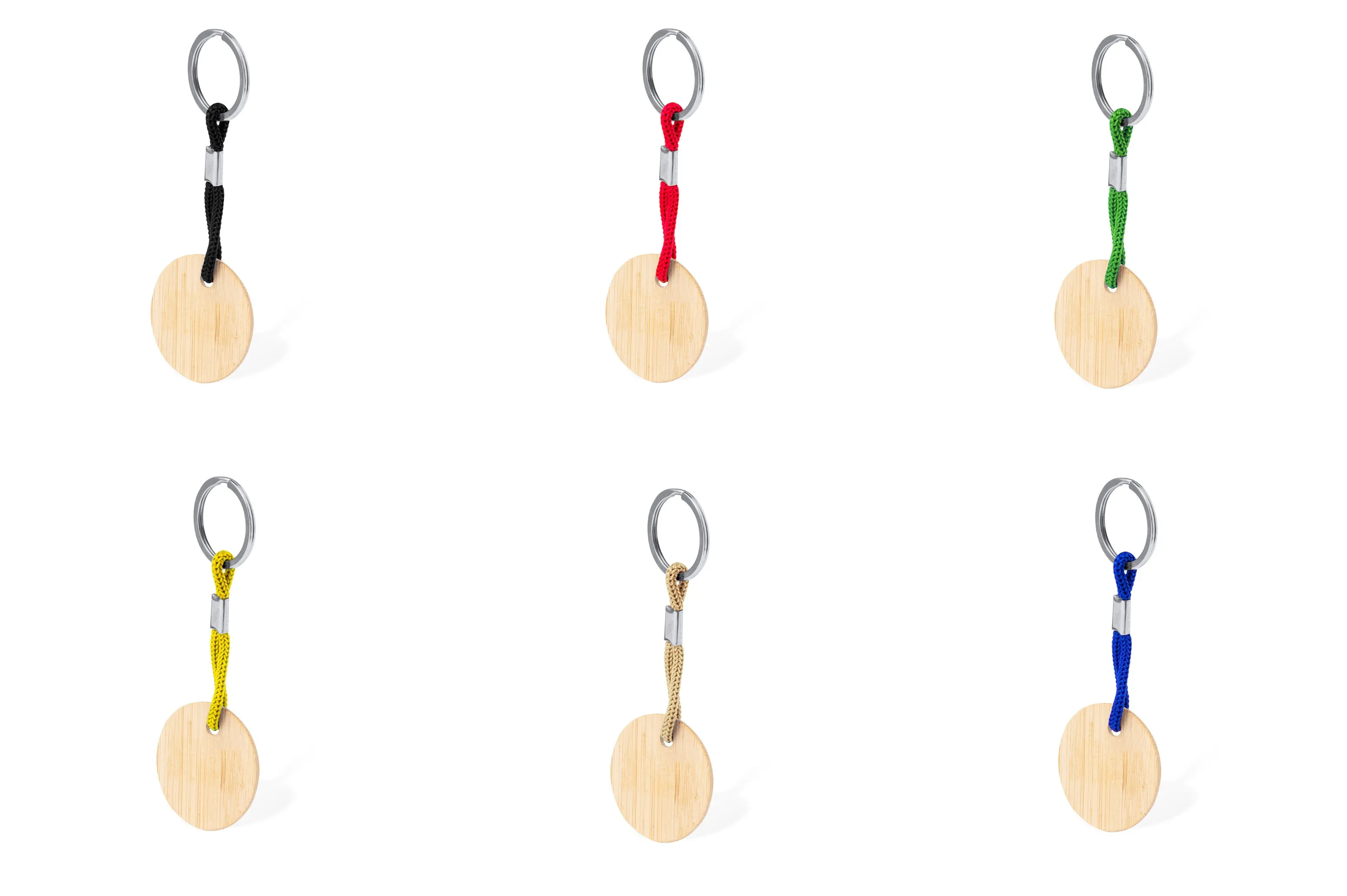 Práctico llavero redondo, fabricado en bambú, con cordón en variados colores.